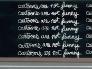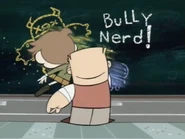 Rudy, who is 8 years old, seen drawing Snap in class while sitting at his desk. Classmate Reggie approaches him, asking if it's a gumball machine. Before Rudy can answer, Reggie picks up Rudy's desk and shakes him repeatedly, taking his lunch money. Rudy gets back at him by drawing Reggie on the chalkboard as a bull ("Bully Nerd"). Reggie uses Rudy as an eraser and at this time their teacher, Mr. Wilter, asks the boys what's going on. Reggie replies that Rudy drew him on the chalkboard, not telling Wilter that he had bullied Rudy previously. Wilter punishes Rudy by forcing him to write "cartoons are not funny" on the chalkboard several times after class.