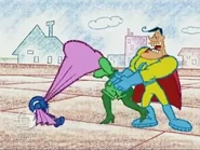 As the dinosaur returns, Snap assures Generic Man he has it under control, but the dinosaur easily swallows him. However, Snap fights back as he punches the dinosaur's throat, causing it to choke. Generic Man does the Heimlich maneuver, sending Snap flying towards a sign. Generic Man tests Snap for x-ray vision and freeze ray when a super villain, Major Brand, uses her powers to take away Generic Man's. Snap plays with her cape to distract her. Major Brand does the same to Snap, though is stunned when it has no effect on him. Generic Man points this out, stating he has no superpowers.